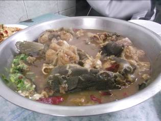 まずは奥の水槽から活きのいいなまずをチョイス。すると、お店の人が徐になまずを床に放して、思い切り太い棒で…。ここのおすすめは、红焖鲶鱼(1斤12元)。人数に応じてボウルで出てくる豪快な一品です。日本では、めったにない食材ですが、実は、DHCやカルシウムを豊富に含み、栄養満点。骨も少なく、消化にもよく、お年寄りや小さいお子様でも安心。一人用のセット(12元)も。