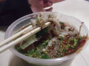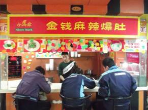 爆肚とは、豚や牛の内臓のことで、特に腸の部分、いわゆる日本で言うセンマイです。そのセンマイに、ゴマダレや特製スープや調味料を入れたものが麻辣爆肚です。カウンター席に座って、立ち食いうどん感覚で注文したら、かっこいいお兄ちゃんの見事な手つきであっという間においしい麻辣爆肚のできあがり(小10元、大12元)。ゴマとセンマイのハーモニーは絶品です。サイドに火焼をつけると、超おいしい♪